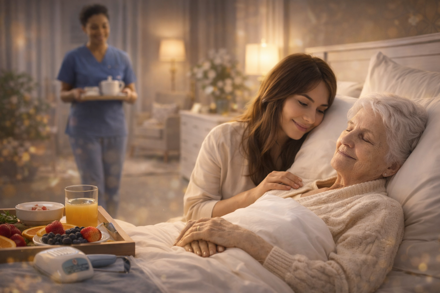 Licensed nurses delivering hospital-level care supported by nutritional and mental monitoring.